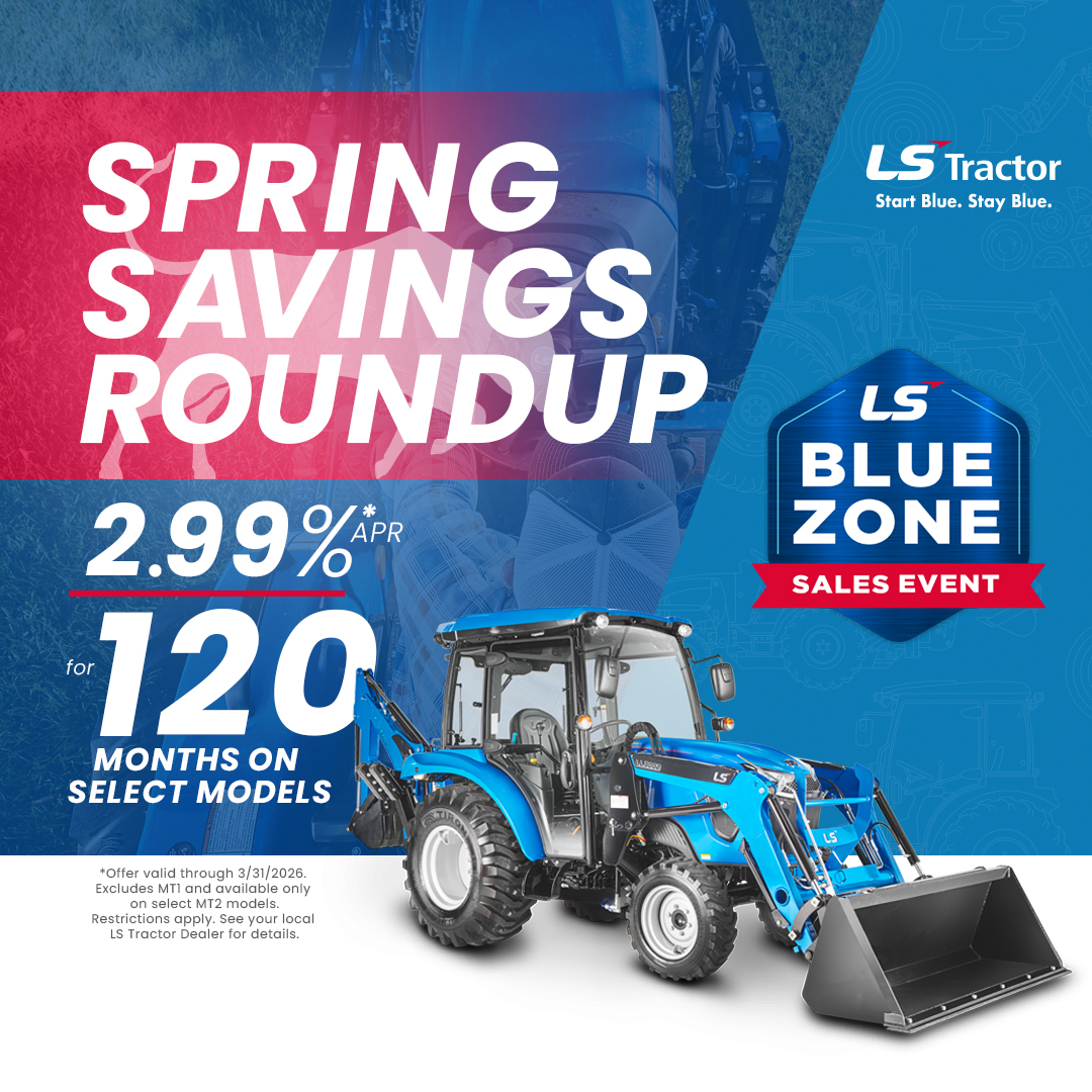 2.99% A.P.R. financing for 120 months is available on select LS Tractor models at participating USA dealers. Excludes taxes and additional fees. Down payment required, subject to inventory availability, lender participation, and credit approval through ACUSI. Does not include backhoe, loader, or mower. Offer valid on qualifying purchases made until March 31st, 2026. Monthly payments may vary depending on borrower creditworthiness. Additional down payment requirements may apply. LS Tractor USA, LLC disclaims all representations and warranties, express or implied, and any liability arising from the use of this material. Promotions, terms, and conditions are subject to change or termination without notice. See participating dealer for full details and program exclusions.”