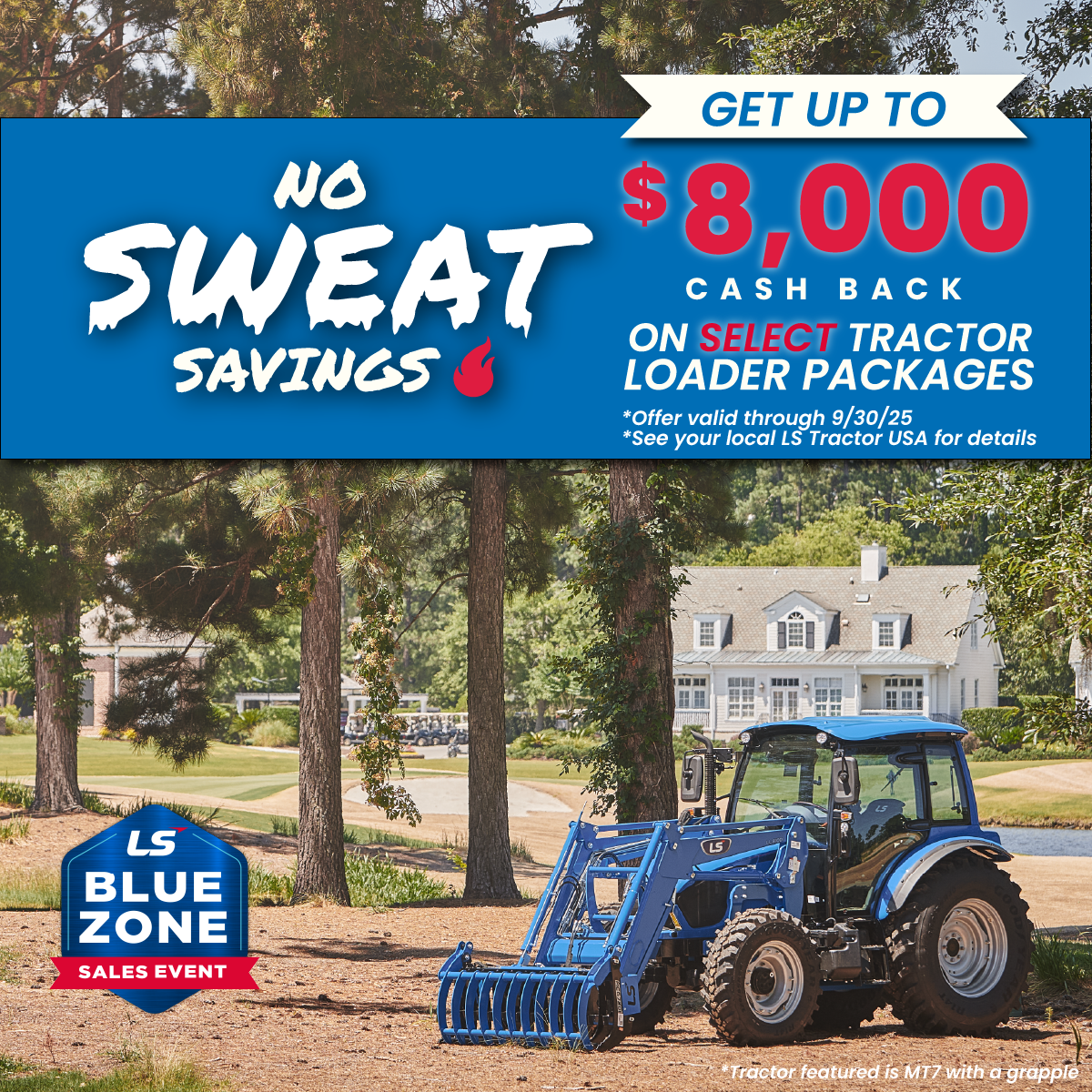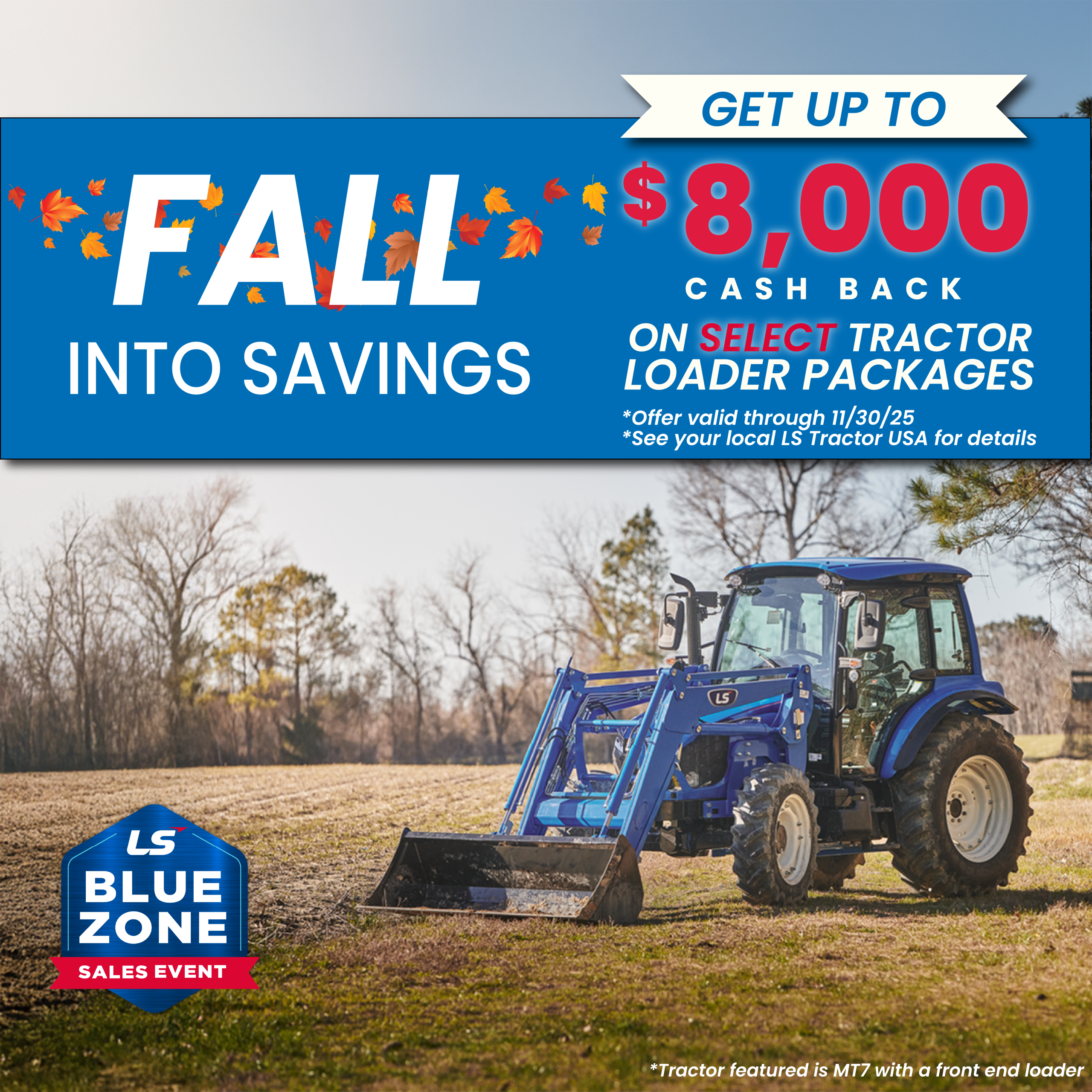 Up to $8,000 in cash rebates on select LS Tractor models at participating USA dealers. Excludes taxes and additional fees. Subject to dealer participation, inventory availability, lender participation, and credit approval. Offer valid on qualifying purchases made until November 30th, 2025. Monthly payments may vary depending on borrower creditworthiness. Additional down payment requirements may apply. LS Tractor USA, LLC disclaims all representations and warranties, express or implied, and any liability arising from the use of this material. Residency restrictions may apply. Promotions, terms, and conditions are subject to change or termination without notice. See participating dealer for full details and program exclusions.”