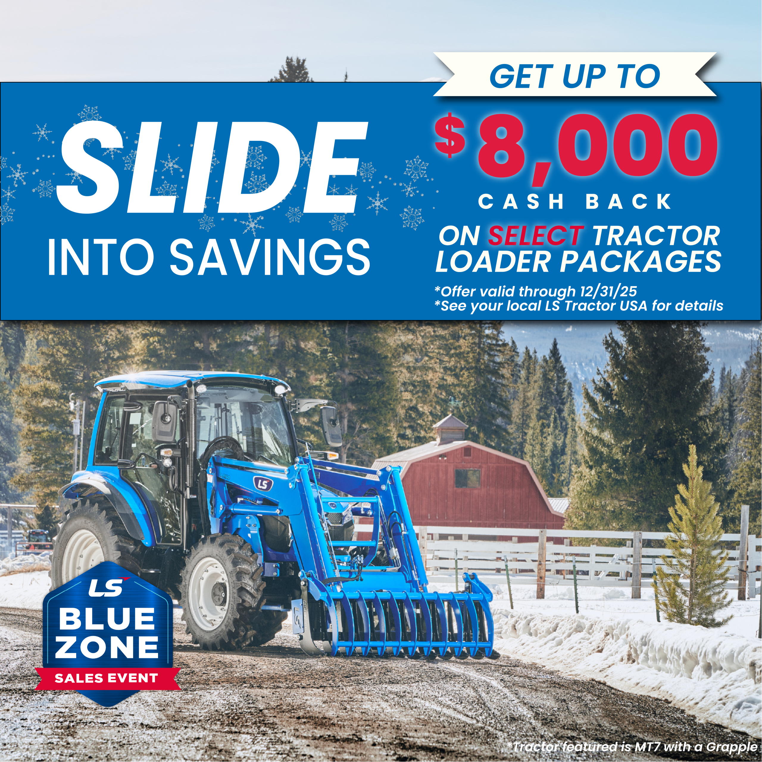 Up to $8,000 in cash rebates on select LS Tractor models at participating USA dealers. Excludes taxes and additional fees. Subject to dealer participation, inventory availability, lender participation, and credit approval. Offer valid on qualifying purchases made until December 31st, 2025. Monthly payments may vary depending on borrower creditworthiness. Additional down payment requirements may apply. LS Tractor USA, LLC disclaims all representations and warranties, express or implied, and any liability arising from the use of this material. Residency restrictions may apply. Promotions, terms, and conditions are subject to change or termination without notice. See participating dealer for full details and program exclusions.”