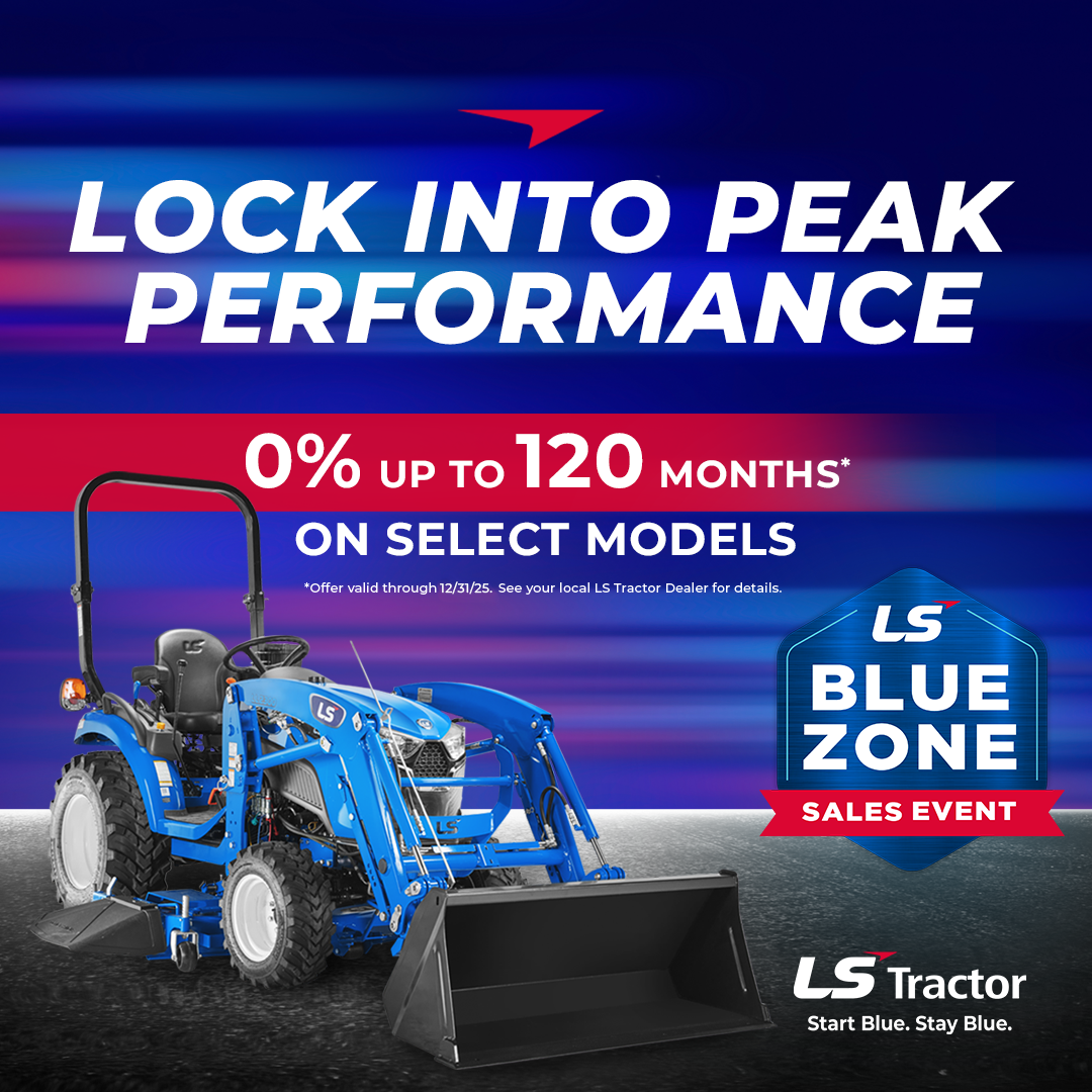 0% A.P.R. financing for 120 months is available on select LS Tractor models at participating USA dealers. Excludes taxes and additional fees. Subject to dealer participation, inventory availability, lender participation, and credit approval through ACUSI. Does not include backhoe, loader, or mower. Offer valid on qualifying purchases made until December 31st, 2025. Monthly payments may vary depending on borrower creditworthiness. Additional down payment requirements may apply. LS Tractor USA, LLC disclaims all representations and warranties, express or implied, and any liability arising from the use of this material. Promotions, terms, and conditions are subject to change or termination without notice. See participating dealer for full details and program exclusions.”